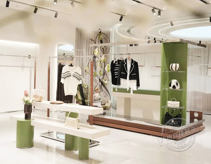 進入X.YING展廳,面積達200平方米。淺米色系的主調(diào)與局部的中古綠相結(jié)合,營造出一種優(yōu)雅復(fù)古的氣氛。根據(jù)空間布局,不同于一般服裝店的需求,展廳中間的場地需要經(jīng)常舉辦公司審樣會、特賣會等活動,因此主要以可移動的中島服裝展柜為主。此處設(shè)計還增加了L型中島掛桿組合和具有儲物功能的飾品柜,以滿足未來大面積店鋪的中島需求。
