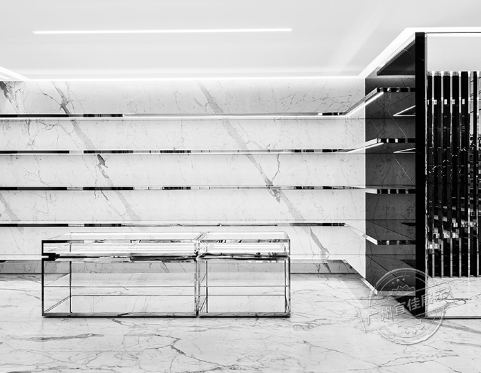 在極簡(jiǎn)黑白的色調(diào)中,加以大量的鏡面、鋼化玻璃、不銹鋼元素,呈現(xiàn)出簡(jiǎn)潔、高端的空間氛圍。鏡面和不銹鋼以相同的材質(zhì)和形式來呈現(xiàn),如局部吊頂、奢侈品展柜造型、隔斷墻等。
